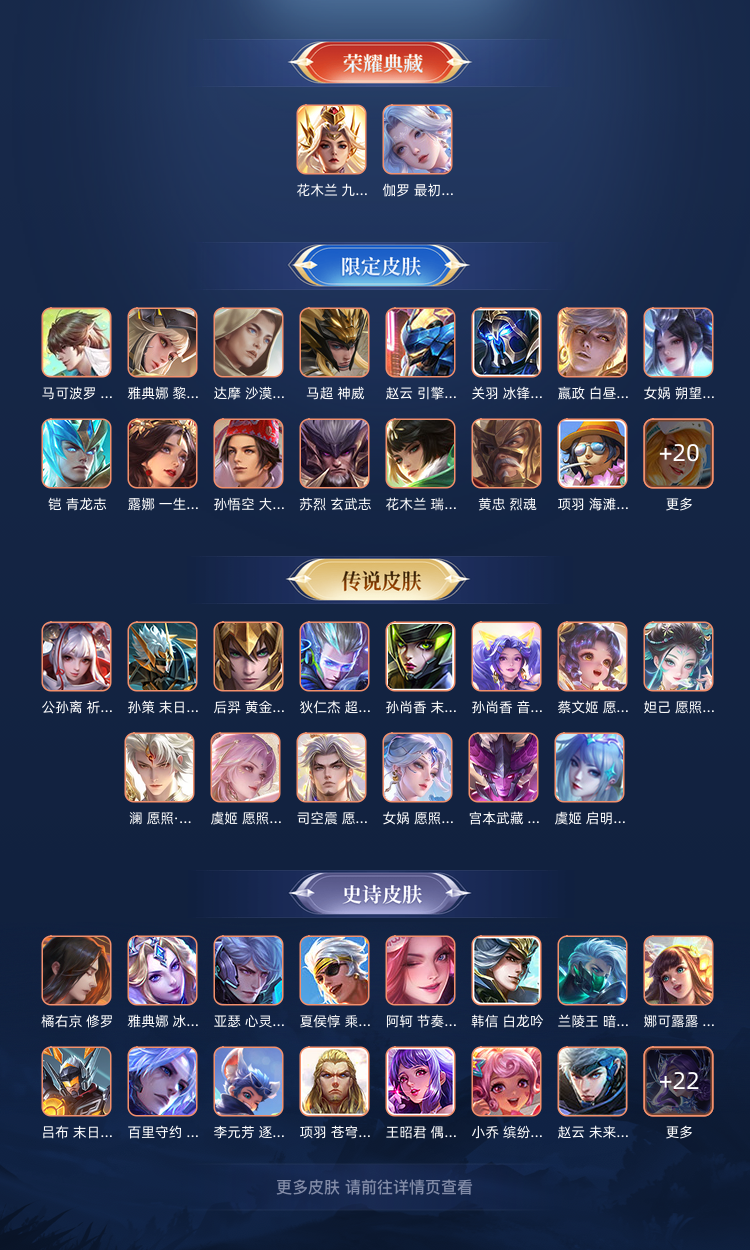 皮肤数: 260 荣耀水晶: 九霄神辉,最初的交响 无双皮: 真我赫兹(瑶),小乔时之魔女,雪境奇遇-甄姬,器灵·螭龙剑 珍品传说: 时之奇旅-孙策,器灵·落星盏 传说皮: 黄金射手座,冠军飞将,云鹰飞将,炽阳神光,末日机甲-孙尚香,地狱之眼,乞巧织情,超时空战士-狄仁杰,末日机甲-孙策,音你闪耀,燃星之曲,幻光神枪,千劫归真 限定皮: 冰锋战神,李小龙,祈雪灵祝,梁祝,引擎之心,烈魂,神威,逐梦之音,青春决赛季,逐梦之光,青龙志,瑞麟志,玄武志,一生所爱,大圣娶亲,默契交锋-花木兰,高山流水,猪悟能,怒海麟威,山海·玄木吟,冰霜神祇,鸣野蒿,愿照·千秋盛,愿照·众生和,愿照·山河定,愿照·岁时盈,愿照·福禄聚,愿照·九州拓
