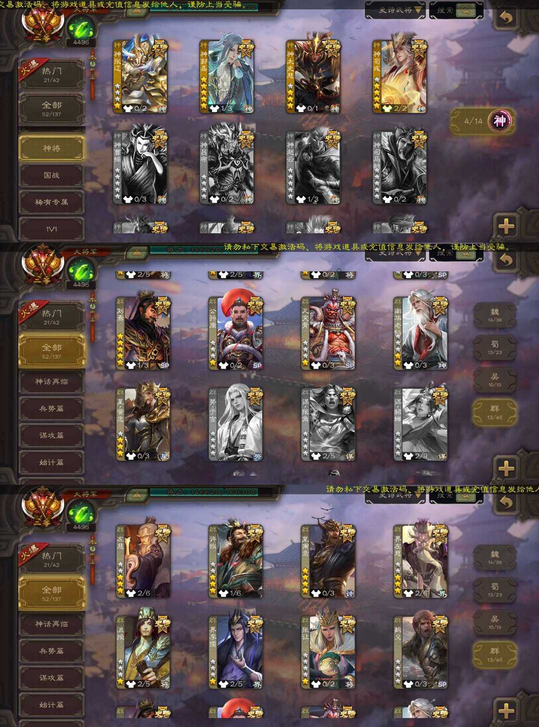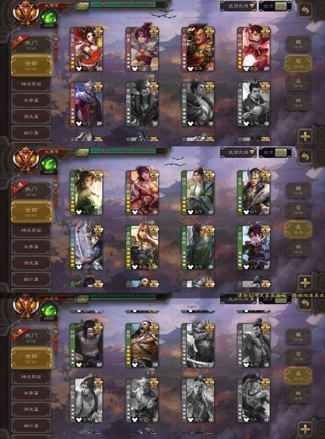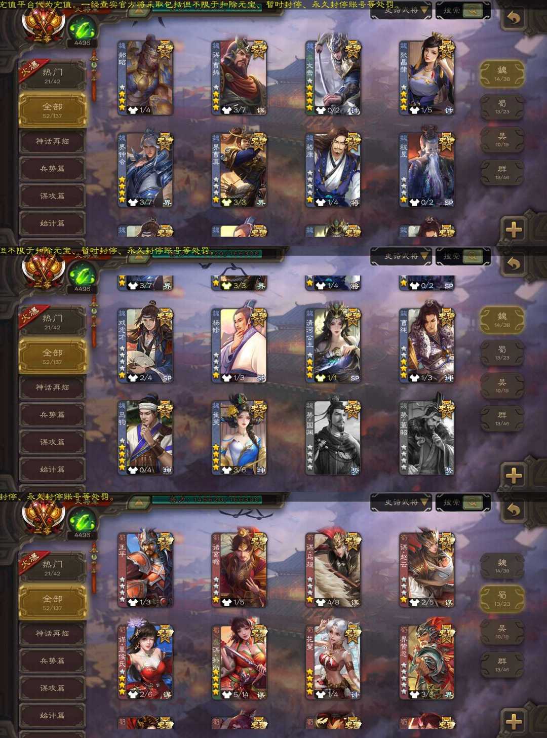 魏:张菖蒲 谋曹贼 双形态界钟会 文鸯 动态清河公主 崔芙 蜀:谋夏侯氏 谋孙尚香 嫣然一笑鲍三娘 吴:动态势陆郁生 留赞 群:动态刘焉 皇莆嵩 南华老仙 神:动态神荀彧 动态神郭嘉 神太史慈